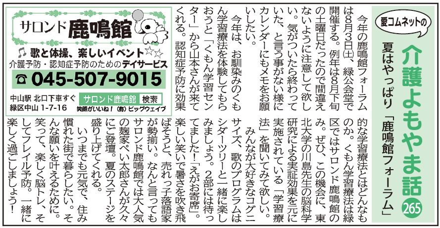 高鹿真杉の介護よもやま話 「夏はやっぱり「鹿鳴館フォーラム2024」!」 第265(2024年 7月掲載)